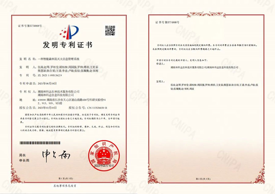 近日,湖南林科達(dá)農(nóng)林技術(shù)服務(wù)有限公司、湖南林科達(dá)信息科技有限公司共同申報(bào)的“一種智能森林防滅火信息管理系統(tǒng)”,獲得國(guó)家發(fā)明專利授權(quán)。這是森林防滅火智能監(jiān)測(cè)領(lǐng)域在科技研發(fā)創(chuàng)新取得的又一突破,標(biāo)志著林科達(dá)核心技術(shù)能力又躍上了一個(gè)新臺(tái)階。
