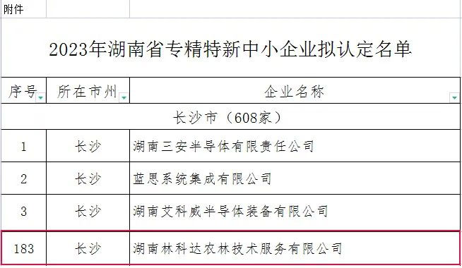 近日,湖南省工業(yè)和信息化廳發(fā)布2023年湖南省專精特新中小企業(yè)擬認(rèn)定名單。通過專業(yè)化、精細(xì)化、特色化和創(chuàng)新能力四類十三個(gè)指標(biāo)考核,湖南林科達(dá)農(nóng)林技術(shù)服務(wù)有限公司憑借在專業(yè)領(lǐng)域的突出表現(xiàn)成功入選。