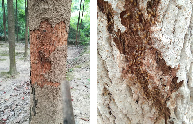 白蟻防治 白蟻?zhàn)鳛榱謽I(yè)有害生物的一種,活躍于每年的4-11月份,具有擴(kuò)散性強(qiáng)、危害大、治理難等特點(diǎn)。采用集中誘殺及釋放天敵等手段,對(duì)黑翅土白蟻、黃翅大白蟻、家白蟻、散白蟻等常見白蟻種類進(jìn)行防治,實(shí)現(xiàn)蟻群數(shù)量控制及殺滅。樹木被白蟻啃食狀態(tài)藥物噴灑與誘捕器設(shè)置